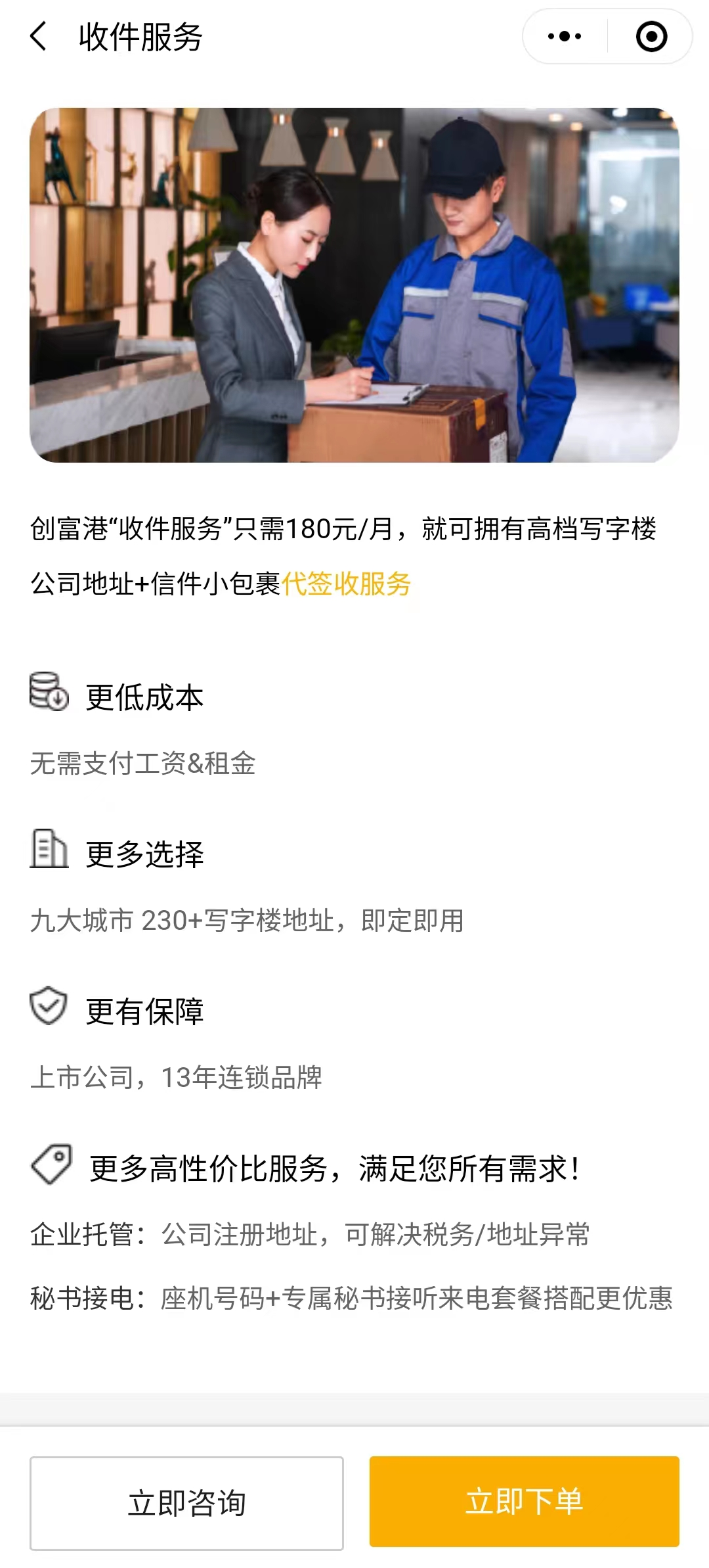 “创富港办公室出租”小程序还提供收件服务,让用户无需支付工资即可拥有专属行政人员,并提供收取邮件和小包裹服务,并及时通知指定联系人领取。