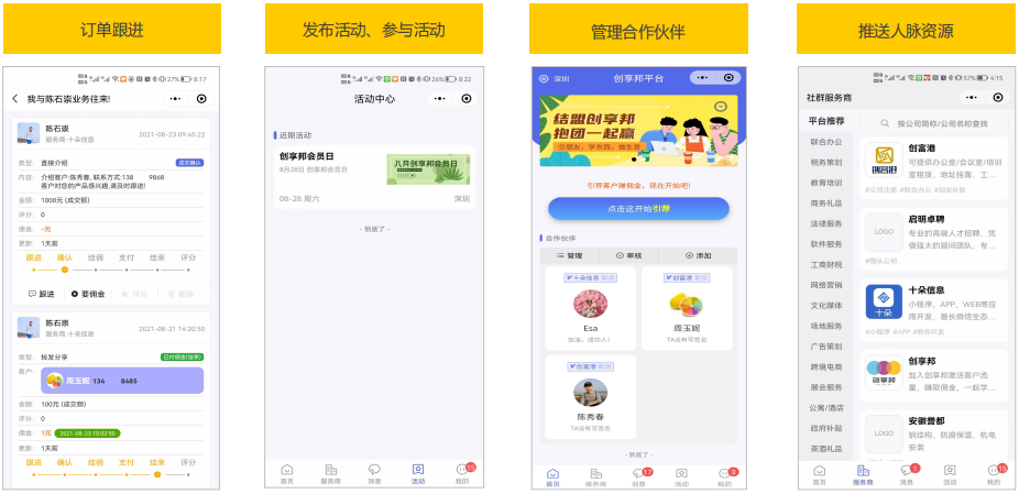 另一个现象,就是企业在经营过程中,经由熟人推荐介绍过来的客户,转化率往往高达百分之九十,跑单率却不足百分之十。针对这两个问题,如果企业能够拓宽“供应商圈”,对接更多的服务商和异业合作伙伴,那么,百分之九十被浪费掉的用户,又重新产生了新的商业价值。「创享邦」包括线上平台和线下活动,双管齐下,帮助创业者高效取得合作伙伴以及信任建立所带来的商业机会。通过「创享邦」线上平台,创业者可以利用推客系统、佣金结算系统、三方互通诚信机制等工具与手段,提升客户成交率。
