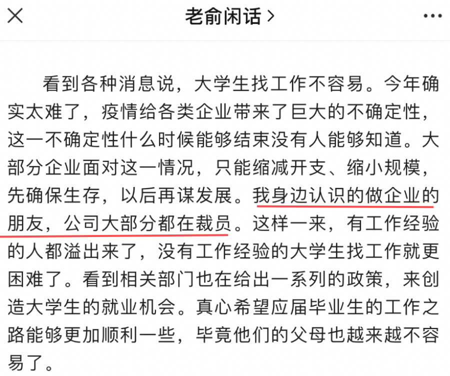 俞敏洪在自己的公众号发了一篇文章,他说:我身边认识的做企业的朋友,公司大部分都在裁员。
