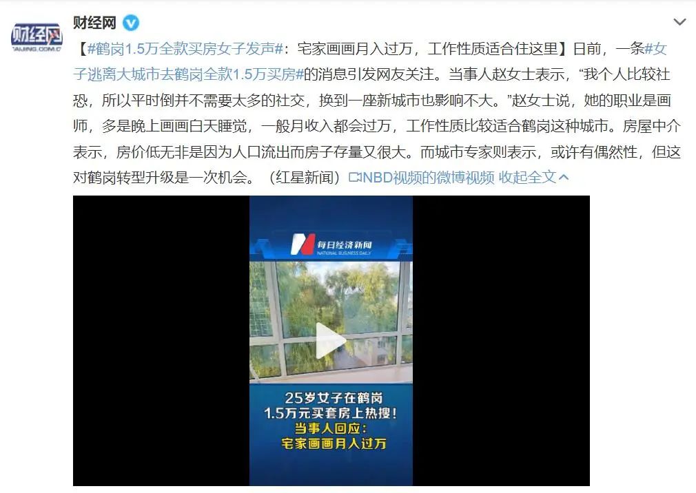 日前,一条#女子逃离大城市去鹤岗全款1.5万买房#消息引发网友关注。一位25岁的自由画师赵女士,感觉在南京租房生活压力很大,于是到黑龙江鹤岗花1.5万元买了一套46平米的房子,甚至每个月花1000元雇保姆打扫卫生、做饭。
