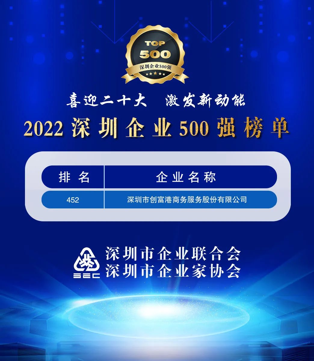 9月21日,深圳市企业联合会、深圳市企业家协会(简称深圳企联)正式发布“2022深圳企业500强榜单”。创富港凭借强大的企业综合实力和影响力,再次荣登“2022深圳500强企业榜单”,位列452位,从2019年起,已连续4年入围。