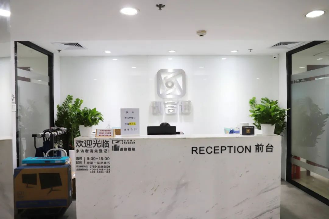 走出电梯口,首先映入眼帘的是接待前台和墙上大大的创富港logo,一股强烈的质朴感扑面而来……