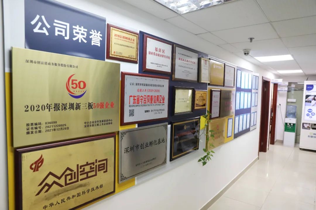 作为一家大企业,总部前台设计竟如此朴实无华。如果把创富港的名称盖上,你或许会认为,这根本就是一家默默无闻的小企业。与之形成强烈对比的,是旁边满满的一面荣誉墙,看着这些荣誉的象征,港妹仿佛见证了创富港近14年发展的历史和辉煌。