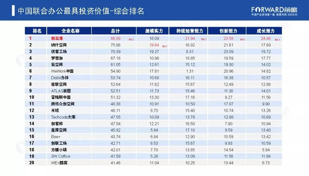 产业园区新三板上市公司成为一支不可忽视的力量,依据业务体量和盈利能力《白皮书》对13家新三板公司综合实力排名,创富港以其5亿元营业收入脱颖而出,力证联合办公商业逻辑行得通。