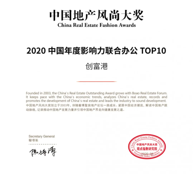 创富港荣获2020中国年度影响力联合办公TOP10。“2020年度中国地产风尚大奖颁奖盛典”现场,创富港在全国众多主流媒体、研究机构、地产开发企业、投资机构、金融投行及专业机构的共同见证下载誉而归。本次获奖也标志着创富港在联合办公行业内一定的影响力以及专家对创富港的联合办公发展模式和综合能力的肯定。