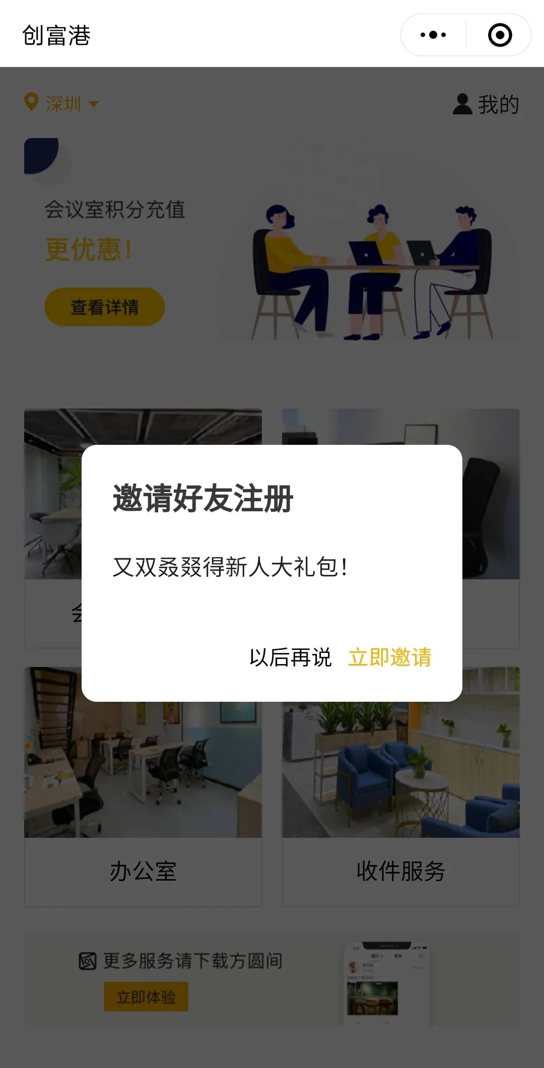 现在去创富港办公室出租小程序,即可领取新人大礼包!(含100元会议室优惠券)