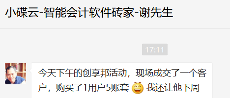 谢总在资源链接环节出色地介绍,收获到了自己的客户,现场刚好有人需要这款上手简单、操作快捷的“小碟云”财务记账软件。