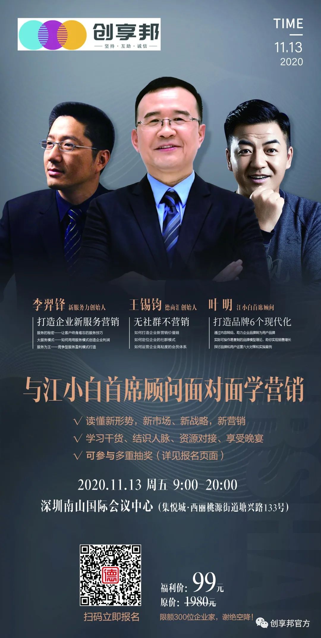 活动费用:创富港、创享邦会员享有福利价99元(含晚宴)