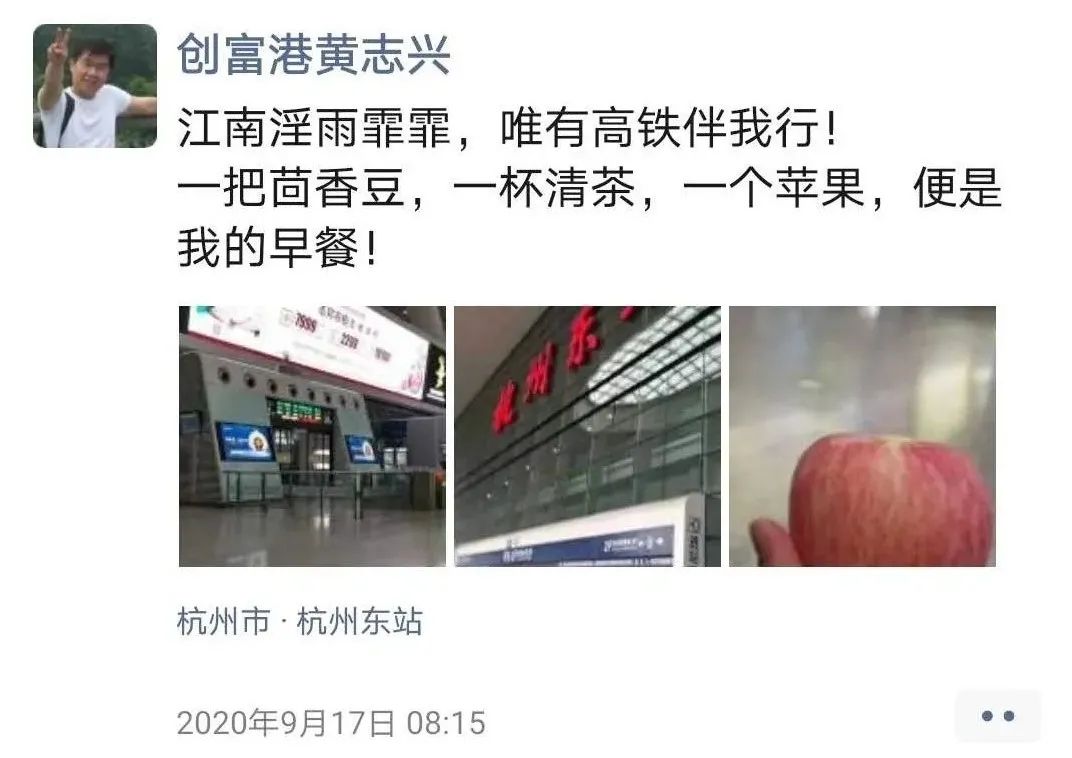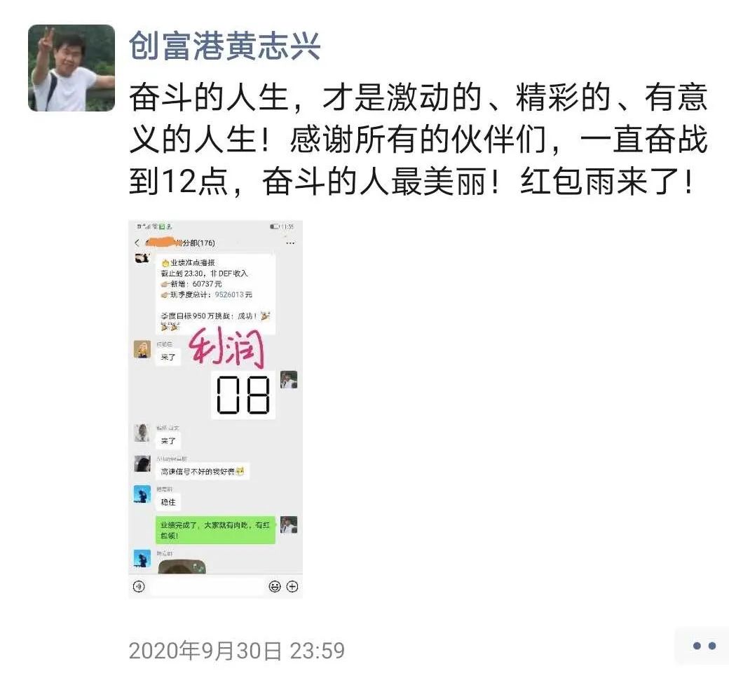 而作为伴随创富港从创立之初发展至今的人,黄志兴身上最深的创富港人烙印,还是坚韧不拔,敢于担当,和每一位创富港人一样,是一位在路上的奋斗者!“我就是一个喜欢挑战自我的人。”黄志兴说:“如果不勇敢地踏出那一步去挑战自己,你永远也不知道自己也能做好其他领域的事情。” 加入创富港以来,黄志兴分管的大区长期保持优秀的业绩。不仅如此,某些在常人看来难度非常大的项目,那些最难打的硬仗,很多都是黄志兴参与解决。此外,黄志兴还促进了创富港与广州珞珈投资、广百集团等合作方的合营。他和他的伙伴们一路“开疆拓土鏖战起,高歌猛进得胜还”!成绩的背后,是黄志兴十几年如一日的不懈坚持和努力付出。“奋斗的人生,才是激动的、精彩的、有意义的人生!感谢所有的伙伴们,一直奋战到12点,奋斗的人最美丽!红包雨来了!”——这是黄志兴的一条朋友圈,时间是2020年9月30日23:59分。这是微信群内团队季度业绩准点播报后,黄志兴对伙伴的激励。“江南淫雨霏霏,唯有高铁伴我行!一把茴香豆,一杯清茶,一个苹果,便是我的早餐!”——这条黄志兴的另一条朋友圈,时间是2020年9月17日8:15分。这是来不及吃早餐奔波在高铁上的黄志兴。“拼搏的意义就是看到满树银花绚丽多彩时的快乐!”——就让我们用黄志兴最新发出的这条朋友圈来作为文章的结尾吧,发出的时间是2020年10月1日凌晨1:02分。嗯,中秋节,国庆至,但奋斗者,永远在路上。港妹:创富港认为,高效率、低成本是一切经营活动的本质,你在工作中是如何践行这一标准的?黄总:对于高效率我的理解是高效率出租,而在出租之前,我会用低成本的标准去谈判、去拿盘,这些前期的低成本的动作就是为了给后期的高效率出租与经营打好基础。除了高效率、低成本以外,创富港还有两句话也至关重要,重细节、畅分享。就是说我们还要做到注重细节的运营,比如精细化分割,和大力提倡大家互相分享经验。港妹:您觉得创富港这12年间,变化最大的地方是什么?黄总:总的来说创富港这12年来肯定是一直在发展的,首先,创富港的团队越来越大的,我们的设计体系、人力体系、规划也越来越成熟化,越来越完善了。其次,我们创富港的胆子也越来越大了,敢拿大的物业,也敢于亮剑了。先前的那些时间,我们在积累,在踏实地打基础,最近我们创富港也开始打造、宣传自己的品牌了。黄总:祝创富港早日上市,能够越做越大。也希望创富港所有的员工小伙伴们都能越来越幸福。最后祝愿创富港的会员伙伴们的企业做的越来越好,创业成功!