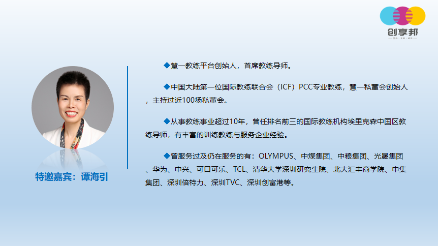 14:30,活动正式开始,创享邦创富者联盟联合创始人、创富港联合创始人兼CEO陈秀春为来宾介绍创富港创立社群联盟的初衷以及创享邦的理念;自我介绍容易吗?如果要把你的姓名、代表行业、产品优势、成功案例、需引荐的渠道、客户可分享的渠道、资源介绍清楚,你需要多长时间呢?在活动中,到场的会员有60秒、嘉宾有30秒的时间做以上的自我介绍。可能有朋友会觉得这点时间不够,但是,想要做好一次精准、聚焦的自我介绍,必须是需要反复提炼、修正内容,以及练习;(大家可以在家尝试练习呀~)茶歇过后,进入到本次活动的正题。慧一教练平台创始人谭海引老师带领大家进行接下来的私董会环节;