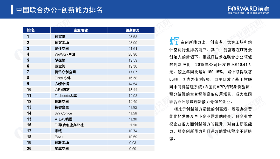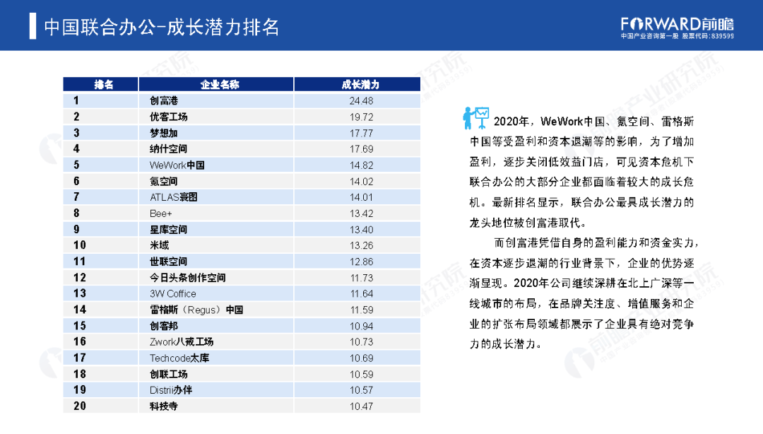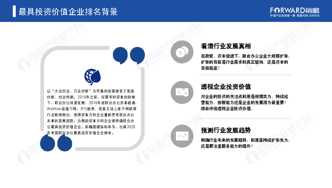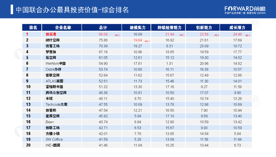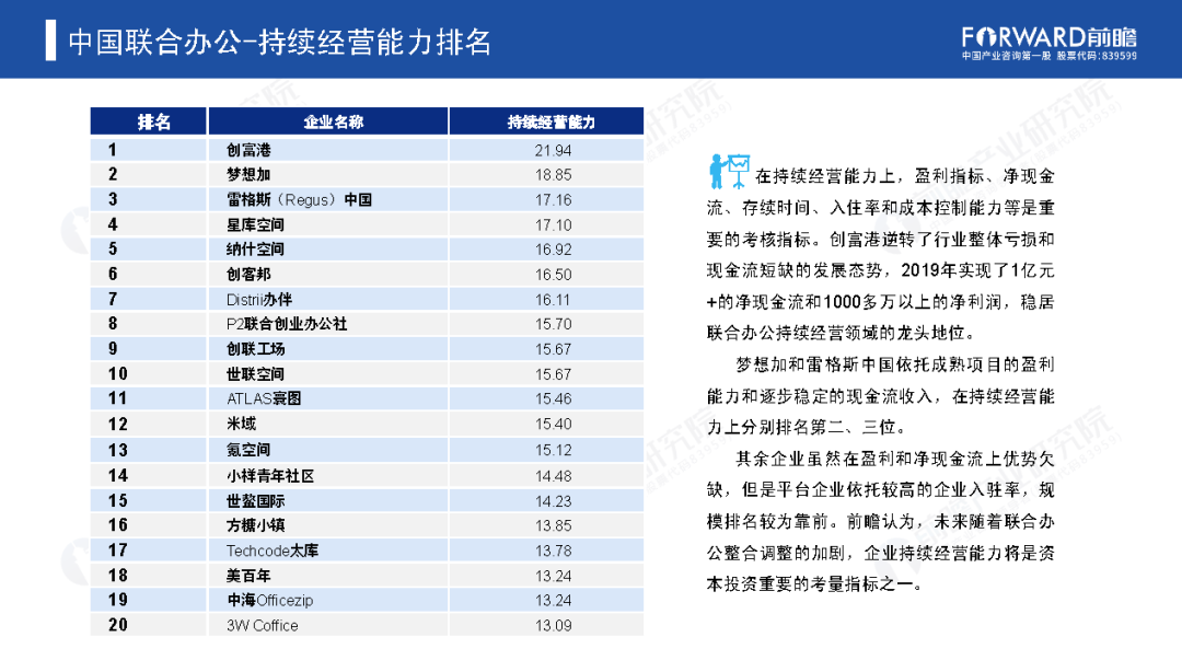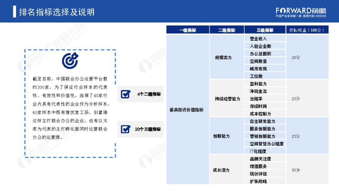 联合办公是一种为降低办公室租赁成本而进行共享办公空间的办公模式,来自不同公司的个人在联合办公空间中共同工作。在特别设计和安排的办公空间中共享办公环境,彼此独立完成各自项目。近年来,以“大众创业、万众创新”为代表的政策激发了我国创新、创业热潮,2019年我国联合办公市场规模达1267.2亿元。为帮助资本方和企业家明确联合办公最具投资价值企业。前瞻搭建指标体系,出具2020年中国联合办公最具投资价值企业榜单。