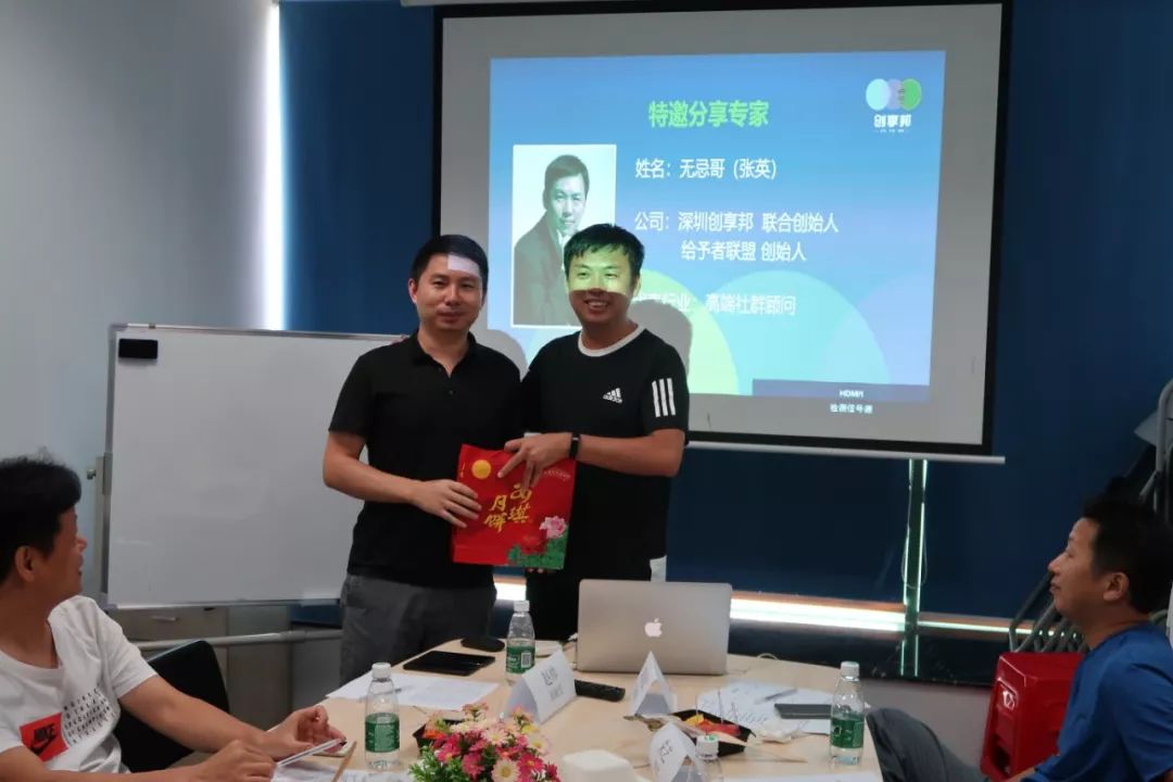 各位来宾各自介绍后,大家一起现场为自我介绍得最好的来宾点赞,同时又由此次活动的特约嘉宾无忌哥(张英)为其送上一份礼品。