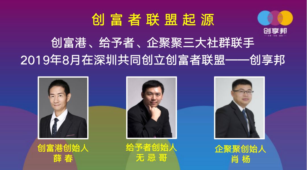 创富港(董事长薛春)、给予者(无忌哥)、企聚聚(肖杨老师)三大社群联手,2019年8月在深圳共同创立创富者联盟——创享邦。