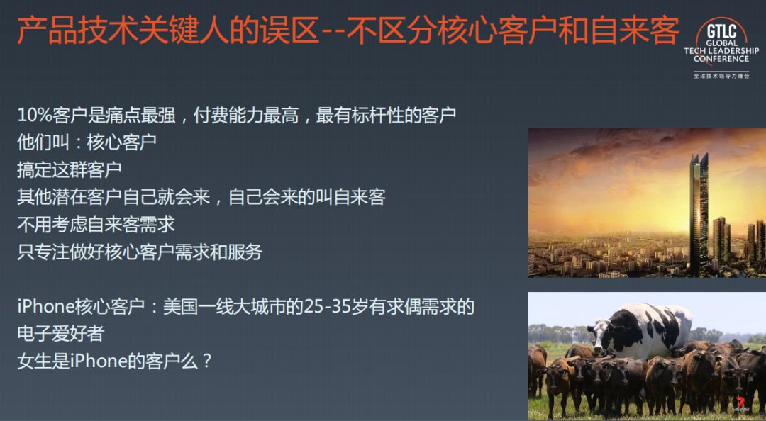 举个例子,iPhone 的核心用户是谁?美国一线城市的 25-35 岁有求购需求的电子爱好者,为什么不是女生呢?因为如果苹果的核心用户是女性用户,那么手机会做得更小一些、颜色会更多样化一些、发短信时一定有很多表情符号,所以我们可以发现,iPhone 只响应核心客户的需求,自来客用户需求压根不管。