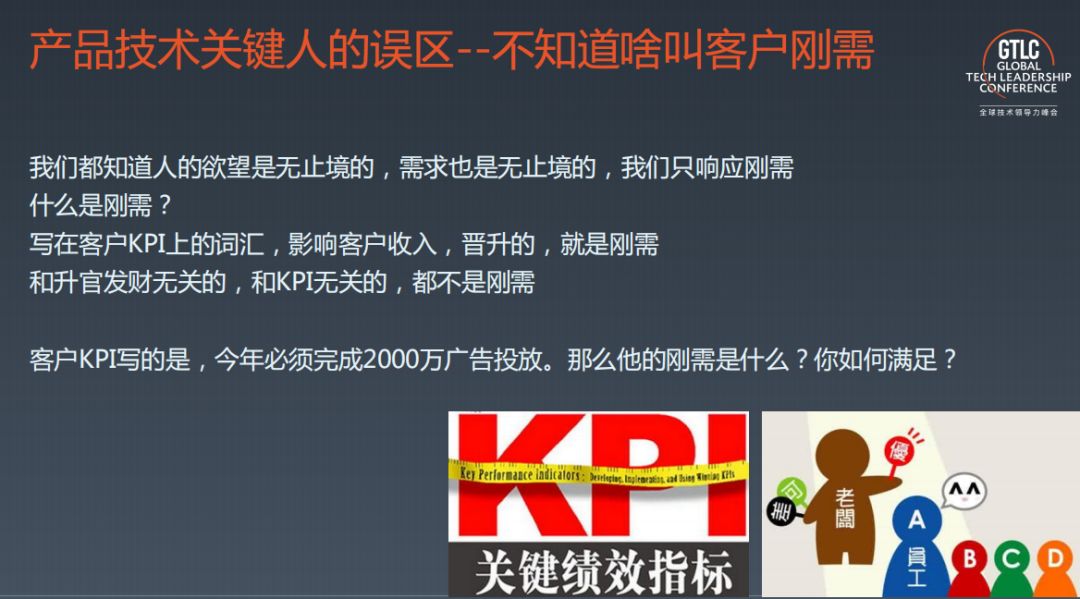 我们都知道人的欲望是无止境的,需求也是无止境的,那么我们只要响应刚需就可以了。比如,客户的 KPI 是今年必须完成 2000 万的广告投放,那么他的刚需是什么呢?写在 KPI 上的,和客户个人做好业绩后升职加薪相关的才是刚需,其他都不是刚需。