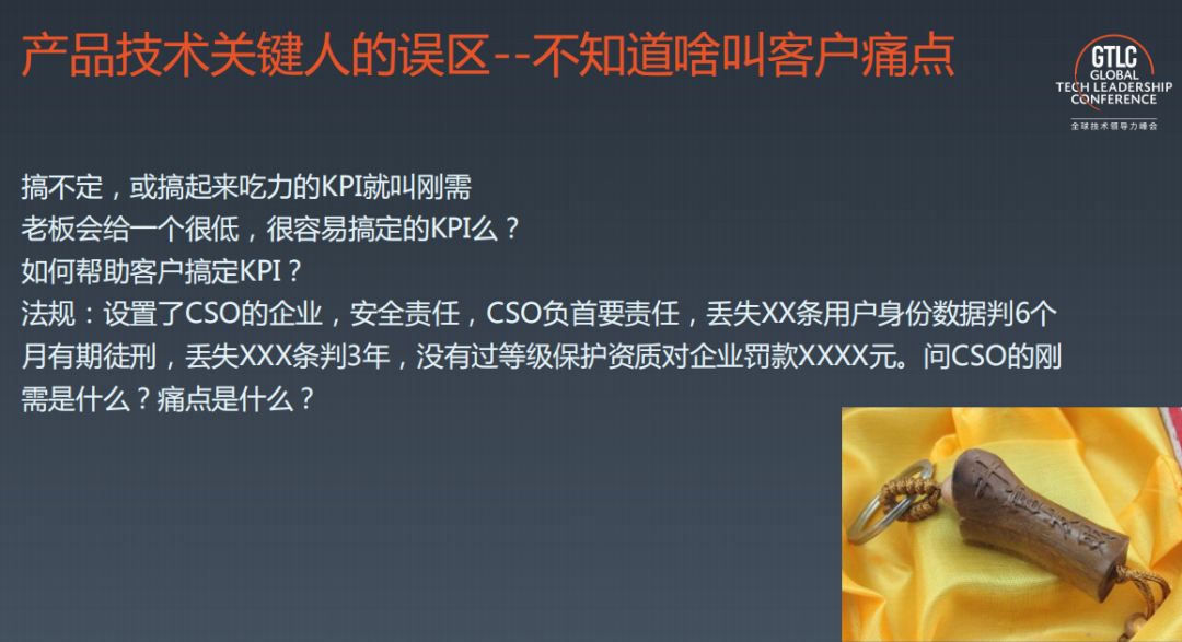 客户痛点是什么?现在《网络安全法》定了,如果网络出现安全事故,如果没有 CSO 就是 CEO 担责,丢失多少条客户隐私数据判刑入狱多少年罚款多少;如果有 CSO 的话,就是 CSO 担责,如果你的客户是 CSO,客户的需求是什么?需求就是不坐牢。怎么能不坐牢呢?赶紧把等保资质拿了,赶紧把数据加密脱敏。