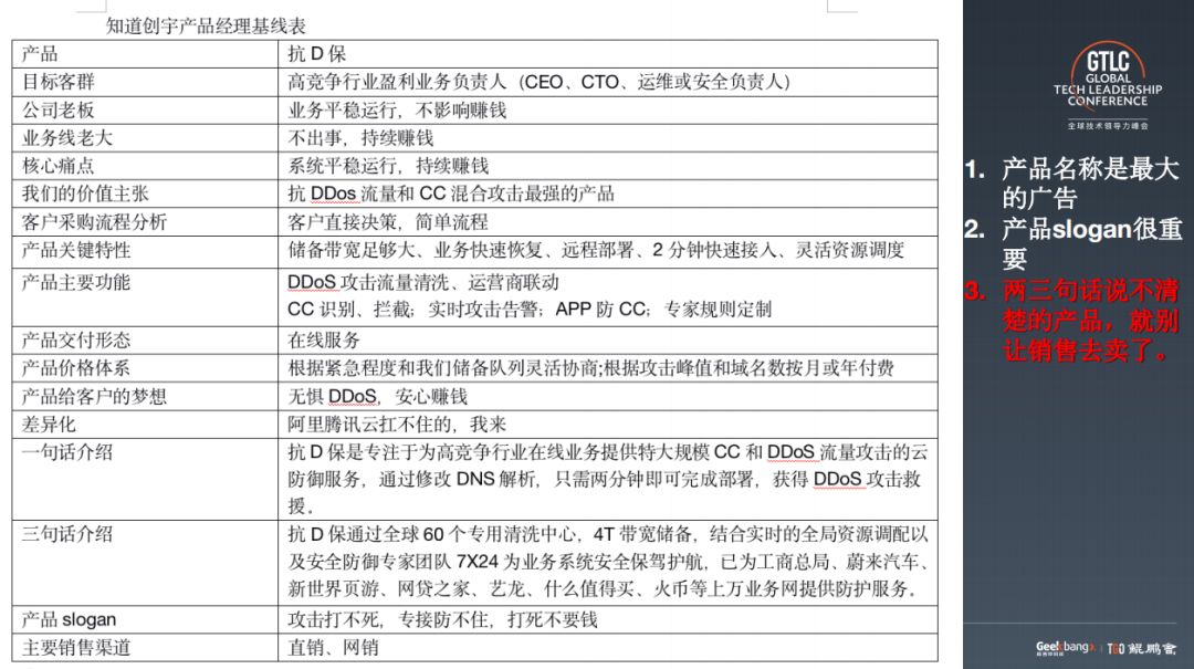 上图为知道创宇的产品经理到商品经理的基线表,举个例子,抗 D 保的目标客群是高净值行业业务负责人,核心痛点是系统可靠持续运行,持续赚钱;价值主张是最强的抗流量和 CC 混合型攻击的产品。