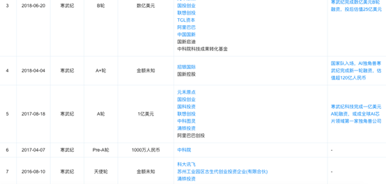 据企查查数据显示,寒武纪在2016年获得了科大讯飞、涌铧投资的天使轮融资,在2017年先是获得了中科院的1000万人民币的融资,后又获得了元禾原点等1亿美元的A轮融资,2018年获得了数亿美元的B轮融资。