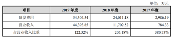 2017年、2018年和2019年,寒武纪的研发费用分别为0.29亿、2.4亿和5.4亿,研发费用率分别为380.73%、205.18%和122.32%。