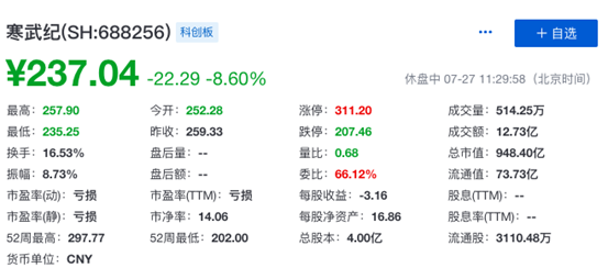据「ToB行业头条」观察,寒武纪自开盘以来股价一路下跌。据雪球数据显示,截止北京时间7月27日11点29分,寒武纪的股价为237.04元/股。