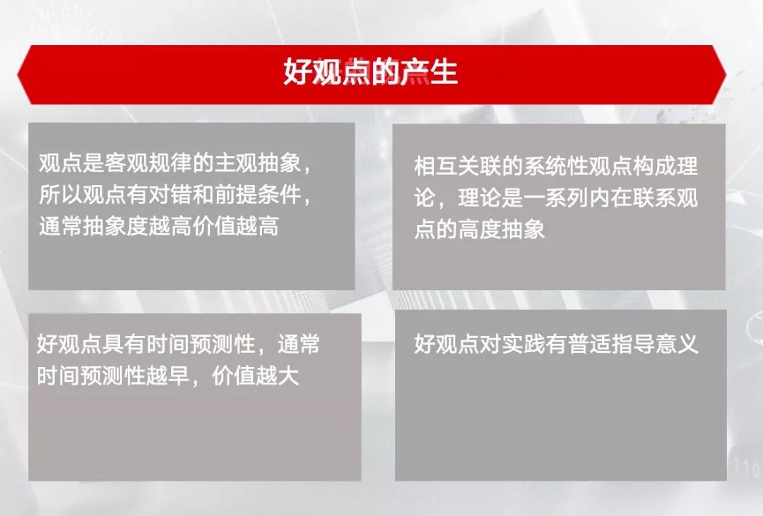 观点一定要在别人还没有发现,或者事实还没有发生前能够用自己的思维逻辑去推论出来。所以我们要尽可能避免纯粹复述别人的观点,正确多提出一些自己的原创观点,这其实是一个很高的要求,需要大量的学习和总结。