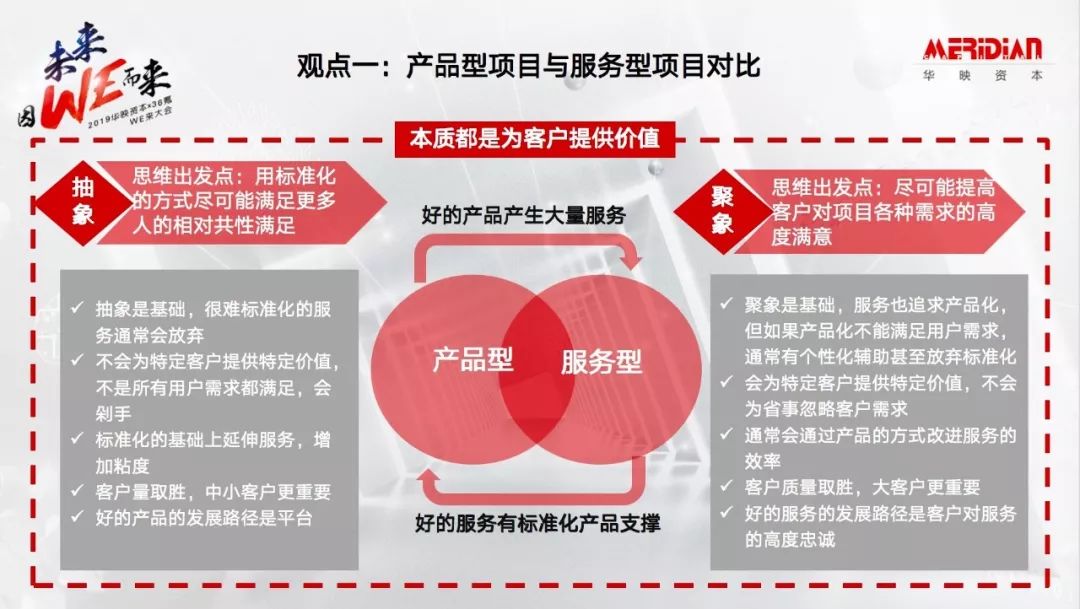 产品型业务的本质是抽象,用标准化的方式尽可能满足更多人的相对共性需求;服务型业务的本质是聚象,尽可能提高具体客户对项目各种需求的满意度。好的产品发展路径是平台化,好的服务发展路径是客户对服务的高度忠诚。