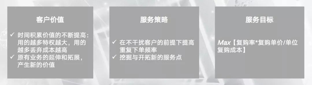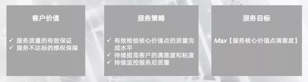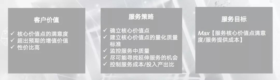 除此以外,要关注核心价值点的量化指标和标准、服务交换过程中的质量监控、尽可能找到延伸服务的机会。总结起来,就是服务价值点满意度和服务提供成本的综合比。