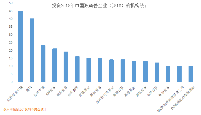 独角兽企业在中国密集的诞生很大程度源于背后资本的热捧。根据投中网不完全计算,2018年的202家中国独角兽企业的总融资规模达到了近1500亿美元。参与其中的不乏知名机构,投资2018年中国独角兽企业数量超过10家以上(包括10家)的PE/VC就达到15家。红杉资本中国以持有45家中国独角兽企业股份位列榜首。