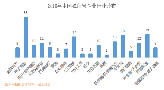 一定程度上,2018年中国独角兽企业的发展的确来自于移动互联网流量红利的孕育。投中网统计发现,2018年的202家中国独角兽企业共分布于18个行业领域。其中,电子商务、智慧物流、新文娱、人工智能、新能源与新能源汽车分列前五。