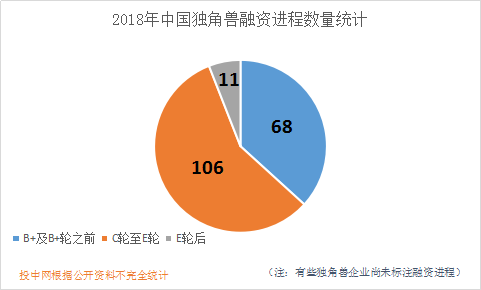 梳理2018年中国独角兽企业当前的融资进程,投中网发现,在202家中国独角兽企业中,目前融资进程到C轮至E轮的独角兽企业有106家,占据一半以上的份额;融资在B+及B+轮之前的独角兽企业为68家,这意味着很多独角兽企业都是初创型企业。