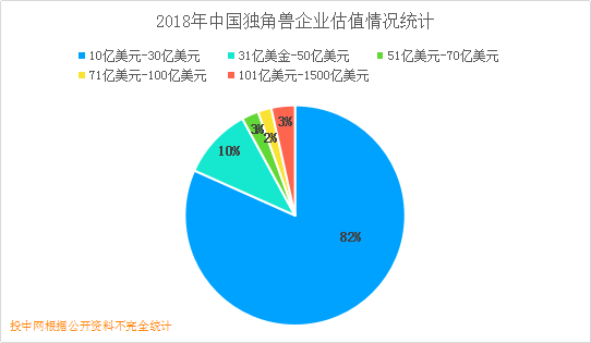 值得一提的是,投中网还发现,在这些独角兽企业估值分布上,估值为10亿美元-30亿美元的独角兽企业居多,占据所有独角兽企业数量的82%左右。这似乎侧面说明,中国的大多数独角兽企业最终能否成为垄断型“真”独角兽,仍然还属未知数。