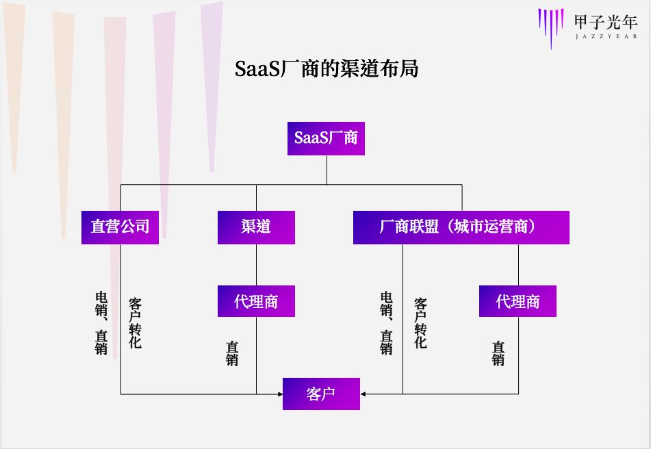 城市运营商扮演厂家在某个地区的总代理,总代理会在区域内自招下级代理。相比过往在一个地区找多家渠道的做法,这种分级管理模式对SaaS厂商来说更易把控。