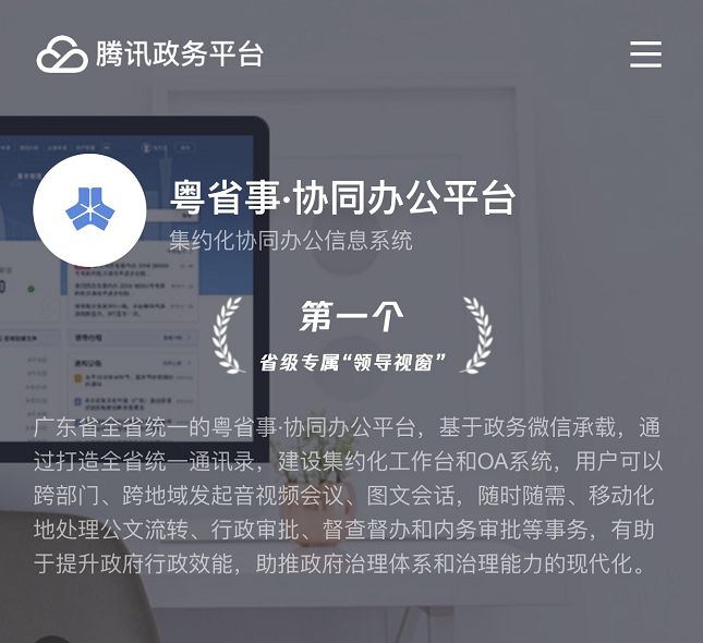 如此前,腾讯与广东省政府合作推出的“粤省事”,其中协同办公平台就是基于政务微信承载的。