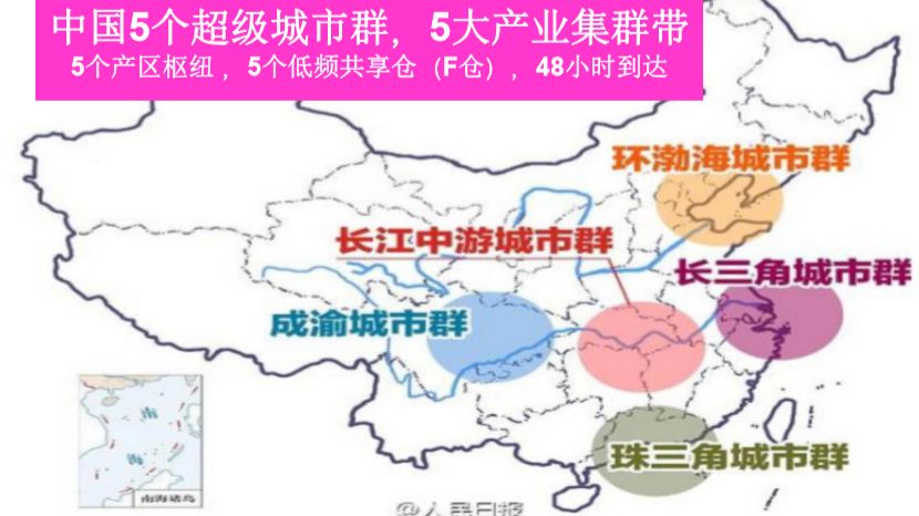 在中国的每个产业集群带,我们可以建立一个全品类的产区枢纽共享仓,直接干线运输到分布在全国各地的销区枢纽,2天到达。这种规模的枢纽我们可以在中国建立5个。