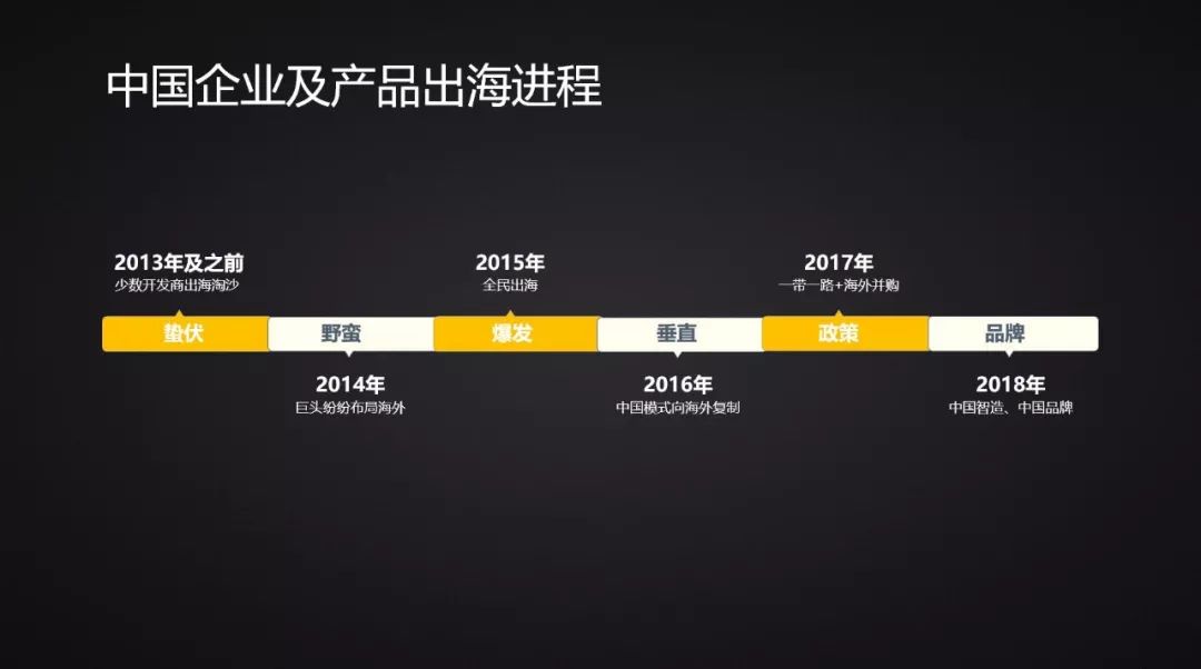 2016年有更多公司开始把中国模式复制到海外市场,随着市场的变化,出海的类型开始多样。2017-2018年,出海的中国公司已经逐渐让产品达到完全本地化的状态,无论是游戏、内容还是电商类产品,海外客户在感知上基本不会认为自己使用的是中国产品,会认为是自己国家的本地产品。