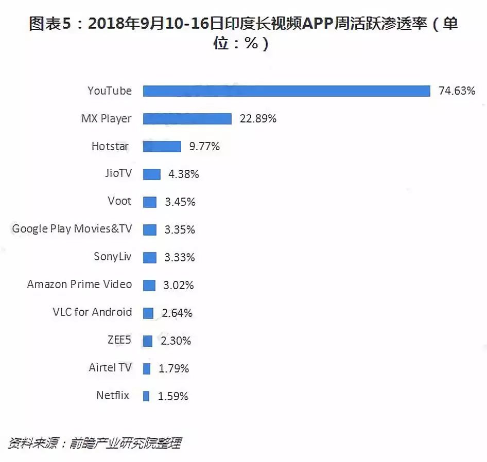 4)在线视频:前面提到,YouTube一个APP占了近20%手机整体使用时长,所以在线视频领域,YouTube在印度一家独大,手机用户每日使用率占比高达70%。在2018年9月10-16日,YouTube周活跃渗透率达到74.63%,这一点中国头部视频APP望尘莫及,因为头部APP只占了3%左右的使用时长。