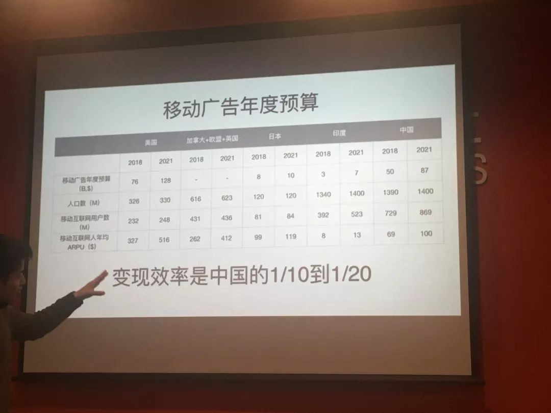 引用Emarketer的数据,印度2018年移动广告年度预算只有30亿美金,而美国是760亿美金、中国是500亿美金,差距非常大。印度的广告预算1/3归Facebook,1/3归Google,1/3归其他公司,所以印度互联网市场跟2000年的中国相似,变现很困难,想要在这里赚钱还需要等待。