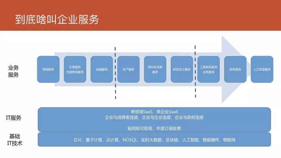 所以说,企业服务是一个完整的从 IT 支撑业务,以及整个端到端的业务链的一个完整体系。
