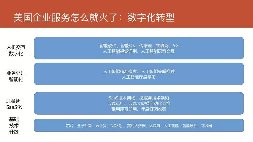 再来看为什么美国的企业服务就火了呢?美国的企业服务火了,恰好是火在数字化转型。中国的企业服务火是火在哪?虽然都是火,但因火的重心不同,中国企业服务千万不能去照搬美国的模式。