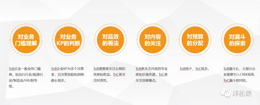 一是关于B2B和B2C业务的区别:虽然关于B2B和B2C,一个服务企业一个服务消费者,有相对清晰的判断标准,不过因为很多企业业务的目标人群既有企业也有企业内的个人,所以无法归类到单纯的ToB或者ToC。比如有个朋友是做花艺的,那她的目标客户即覆盖到企业,也会有一些口碑带来的个人客3户。