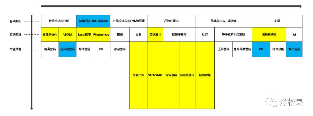因为数字营销的知识和技能范围很广,我整理了一下Tshape模型,用来自己技能拓展的参考,分享给大家。(黄色部分是比较擅长的,蓝色部分是希望近期重点去学习的)