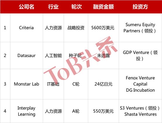 本周共收录国外ToB领域4起融资,主要集中在3个领域,分别为人力资源、人工智能和IT基础领域。