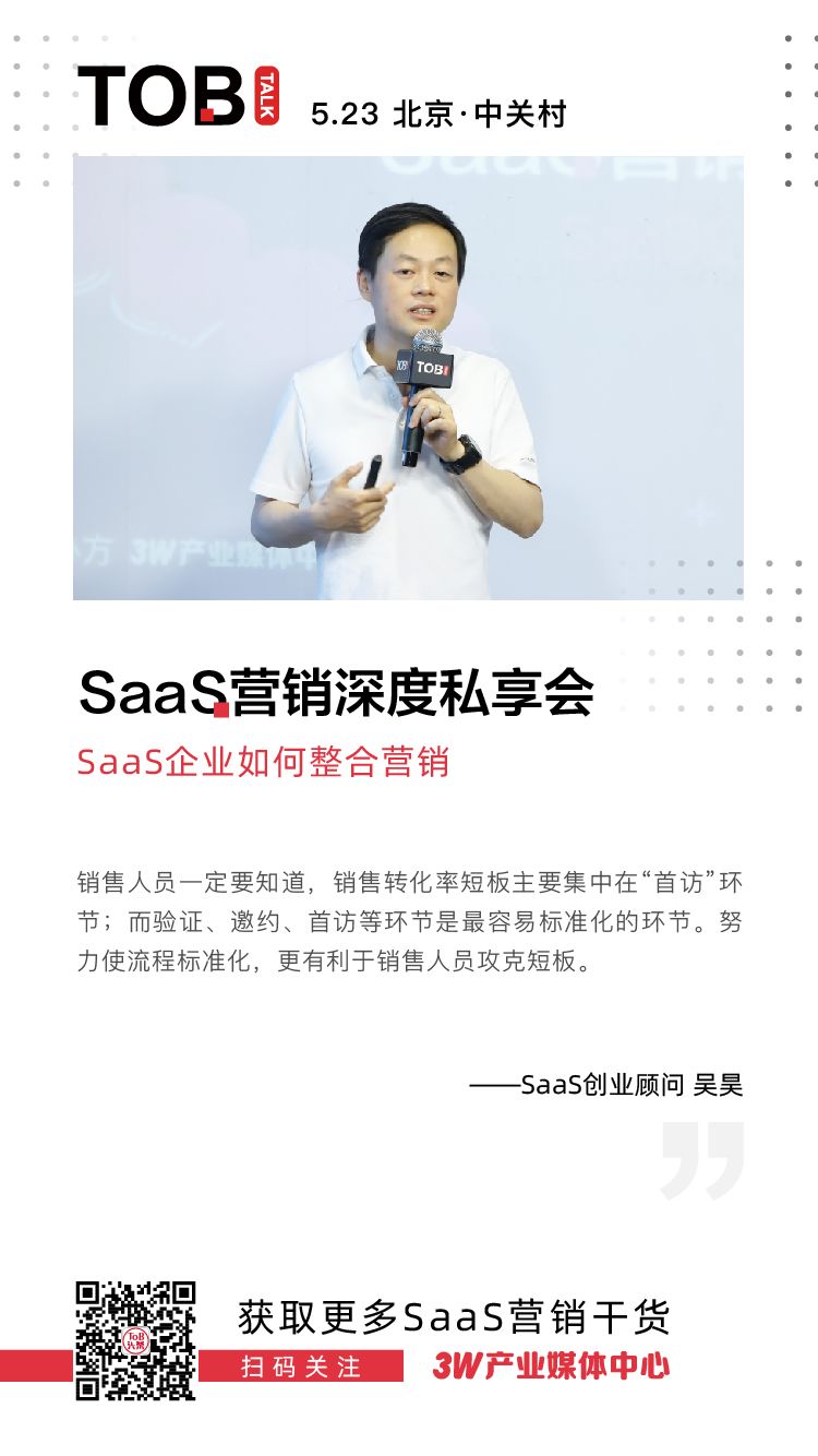 为了解决这个问题,3W媒体产业中心联手著名SaaS创业顾问吴昊、致趣百川CEO何润、纷享销客联合创始人刘晨、容联七陌COO彭伟、易观CGO邱胜等ToB大牛在5月23日举办了《ToB Talk SaaS营销深度私享会》。