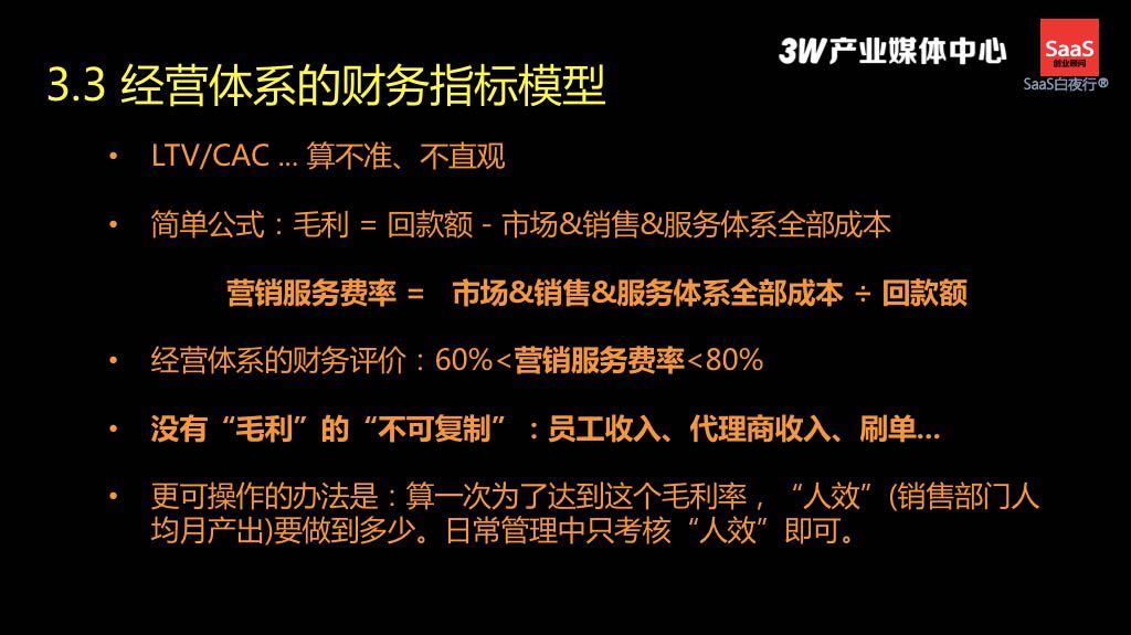 当企业确立了相关的财务模型,就可以推导出每个销售人员的人效。如果公司销售部门的人均月产出不到4万,我个人觉得,公司的业务是很难跑通的。所以,在这个阶段的企业的管理中,考核“人效”将成为重要任务。