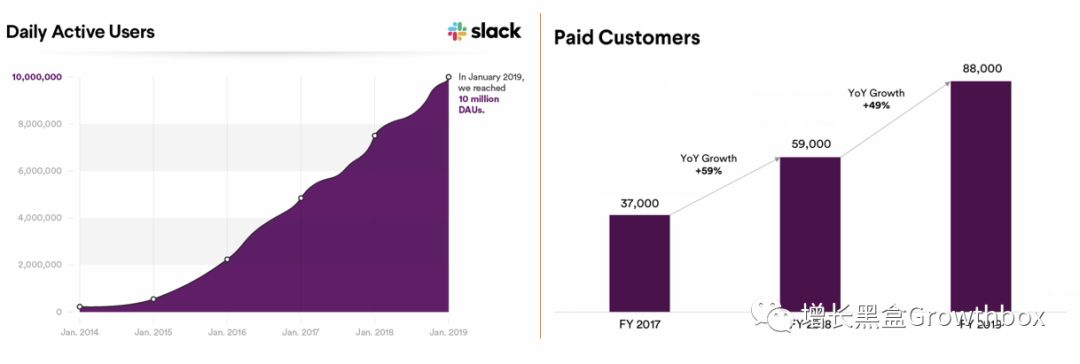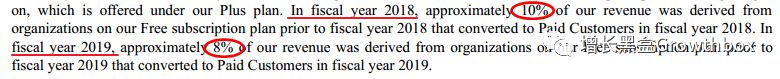付费转化的降低也可从公开数据中获得一定线索。从Slack招股书公布的数据显示,2018财年有10%的利润来源于上一年的免费用户,而2019财年只有8%的利润来源于去年的免费用户。