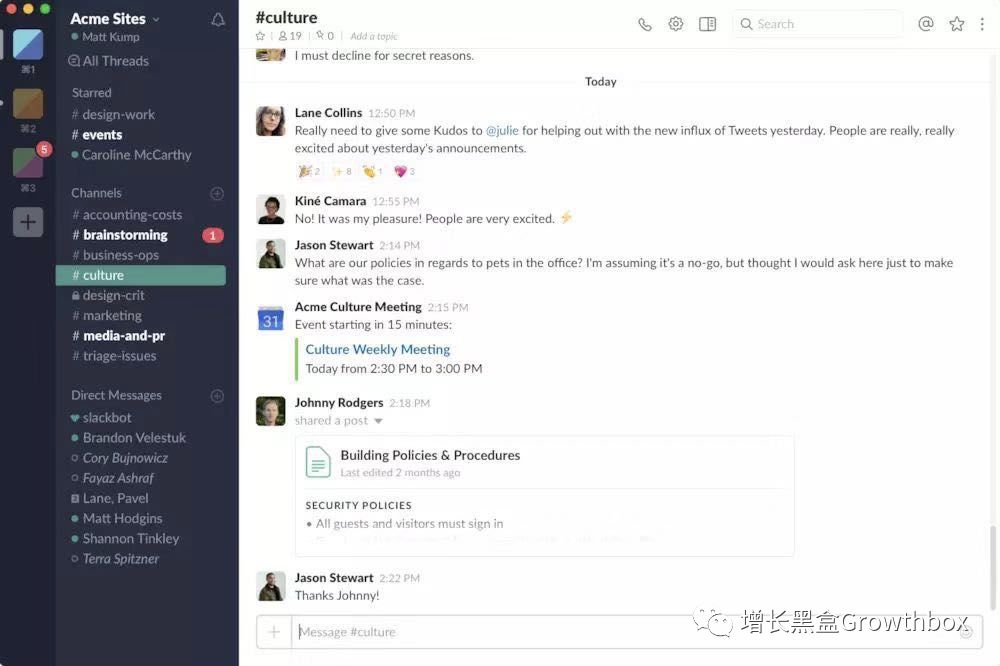 Slack作为一款协同办公SaaS,同时兼具了创新性和超高的用户体验:它集成了即时聊天(IM)并利用API打通了众多第三方软件,企业员工可以在Slack上一站式应用代码托管、项目协作、聊天、云盘等功能——这与当前国内的钉钉、企业微信、飞书非常相似。