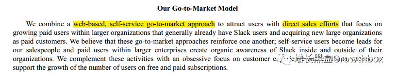 我们从它的招股书中可以发现,Slack的营销模式的阐述中,也非常注重网站的地位。Slack营销获客的主要方式被其称为“web-based, self-service go-to-market approach”,可以理解为“基于网站的自助式营销”。简单来说,是指运用一定的市场营销手段吸引用户来到自己的网站,注册成为免费用户,了解到Slack的价值后,推广给整个团队使用。随后才是运用传统的直销方式(例如高管活动、用户支持等)进行大客户的跟进。