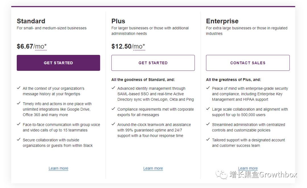 转化的一方面,是以自助(self-service)的形式。Slack提供了Standard、Plus和Enterprise三个付费版本,用户可以自行来到Slack的付费页面,查看订阅计划并付费。除了Enterprise版本需要联系销售人员外,其他两个版本都可以在网站自助开通。