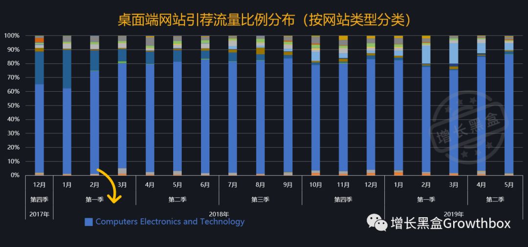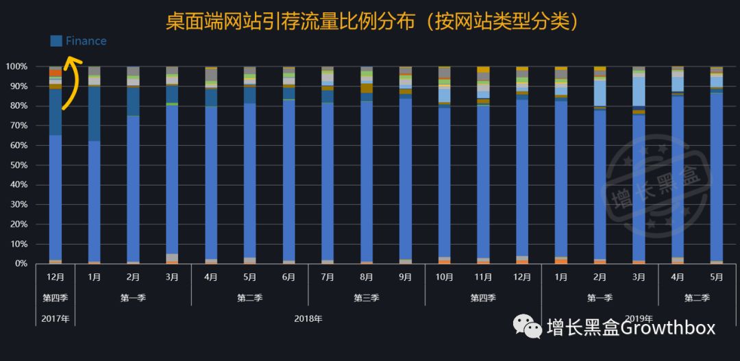 而在桌面端引荐流量中,我们发现,2018年初出现一批金融类网站的引荐流量。