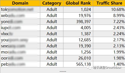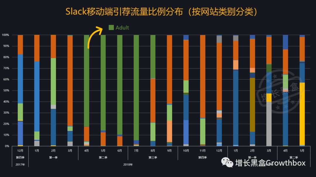 观察移动端网站引荐流量,可以发现,在2018年第二和第三季度,有大批成人网站的引荐流量出现,体量十分明显,玩法与比特币网站类似,同样是创建各种讨论组。但几个月后便销声匿迹,猜测可能有Slack主动的力量介入,毕竟对于企业SaaS服务,如果任由这种流量发展对其品牌建设将是沉重的打击。
